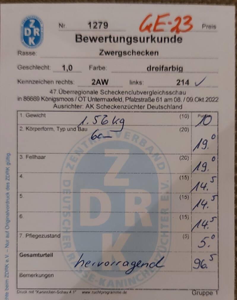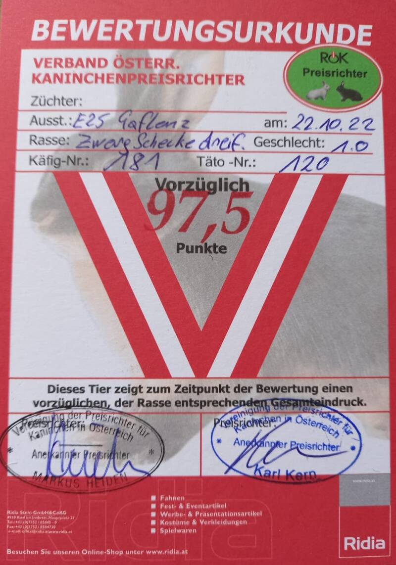 Hier links en rechts de goede showresultaten van een mooie ram die in 2022 is gefokt. De betreffende ram is op de Uberregionale Scheckenvergleichsschau verkocht en ik ben trots en blij dat de nieuwe eigenaar goede showresultaten heeft met 😉 "mijn" ram.